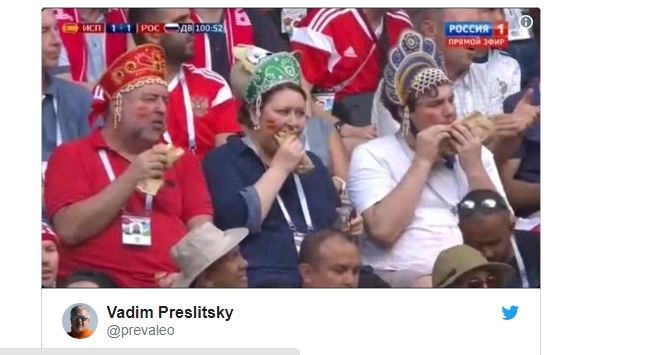 Как сообщает replyua.net, компания болельщиков в кокошниках, которые поедали хот-доги во время матча, стала настоящей звездой Интернета. Пользователи отмечают, что эти болельщики были самыми спокойными на игре, и создается впечатление, что они пришли на стадион не болеть за российскую сборную, а просто перекусить. «Игра игрой, а обед – по расписанию», «Безмятежные», «Шла 252-я минута матча», «Добавочное время – добавочное питание», «Это сироты! Тяжелое наследие девяностых», «Стандарт русской красоты», - шутят пользователи. Напомним, что вчерашний матч между Россией и Испанией стал одним из самых драматичных.