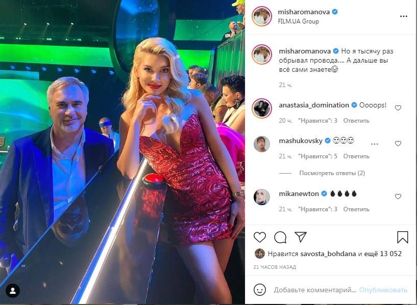 Бывшая солистка группы «ВИА Гра», украинская исполнительница Миша Романова запостила в «Инстаграм» новое фото с популярным российским исполнителем Валерием Меладзе, передает Replyua.net. Отметим, артисты приняли участие в шоу «Поют все» на телеканале «Украина». В кадре Миша позировала в красивом вечернем мини-платье с оголенными плечами и красиво выделенным декольте. Свой образ Романова дополнила локонами и макияжем. В то же время Меладзе позировал в костюме и белой рубашке.
