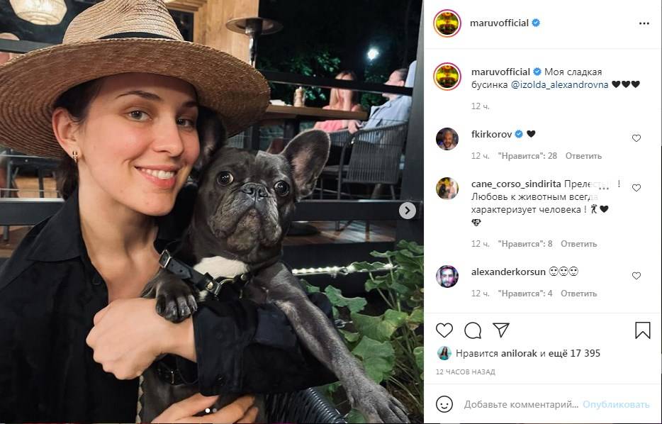 Украинская популярная певица Марув, настоящее имя которой Анна Корсун, опубликовала в сети серию новых фото, которые моментально стали популярны. Публикация появилась на личной странице Марув в «Инстаграм», передает Replyua.net. Отметим, перед камерой украинская исполнительница предстала без косметики, в шляпе, и без привычного для нее вызывающего наряда. Из одежды на Анне была черная кофта, и она держала на руках свою собаку Изольду. «Моя сладкая бусинка», - лаконично подписала пост певица.