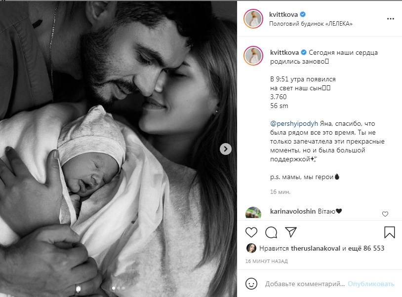 Украинская популярная блогерша и победительница проекта «Холостяк-9» Даша Квиткова сегодня, 13 июля, родила первенца. Об этом молодая мама сообщила на личной странице в «Инстаграм», передает Replyua.net. Стоить указать, что Даша уже обнародовала первые фото мальчика, показав его лицо. «Сегодня наши сердца родились заново. В 9:51 утра появился на свет наш сын. 3.760, 56 sm. Яна, спасибо, что была рядом все это время. Ты не только запечатлела эти прекрасные моменты, но и была большой поддержкой. p.s. мамы, мы герои», - написала под черно-белыми снимками Квиткова. Всего за несколько минут пост оценило более 86 тысяч пользователей сети. Люди также усыпали знаменитость комментариями, поздравляя с рождением сына.
