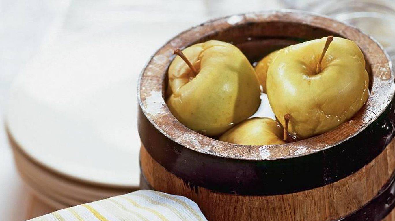 Его приготовление отнимает немного времени, но при этом сохранить мочёные яблоки можно до 12 месяцев. Для их приготовления возьмите 4-6 кг жёлтых яблок, 10 л воды, 100 г соли и 2 стакана натурального мёда. Для вымачивания яблок лучше всего подойдет специальная бочка. Если у вас такой нет, воспользуйтесь любой глубокой посудой, можно взять пластиковое ведро. На дно посуды выложите вымытые яблоки, в отдельной посуде в 10 л воды растворите соль и мёд, хорошенько перемешайте и кипятите этот маринад в течение получаса.