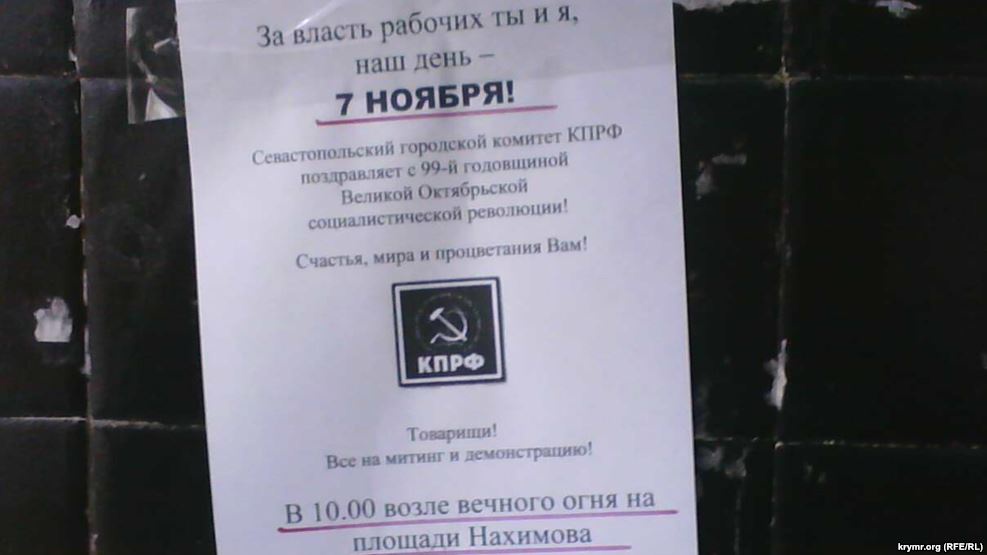 Издание «Крым.Реалии» сообщает, что партия коммунистов в Севастополе расклеила по всему городу листовки, адресованные «Товарищам», которых она призывает поучаствовать в торжественных мероприятиях и демонстрации, посвященных годовщине революции - передает replyua.net.