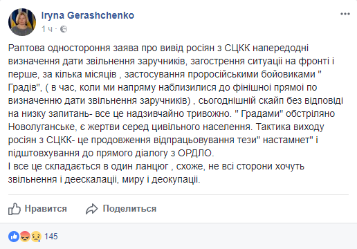 Согласно мнению Ирины Геращенко, тактика выхода российских военных из Совместного центра по контролю и координации – это «предложение отработки тезиса «нас нет там» и подталкивание к прямому диалогу с главарями ЛДНР». «Как показывает сложившаяся ситуация, похоже далеко не все стороны хотят освобождения и деэскалации, а также мира и деоккупации». Напомним, ранее издание, ссылаясь на сообщение Ирины Геращенко, отмечало, что новыми списками со стороны ОРДЛО на обмен пленными, боевики могут сорвать обменный процесс.
