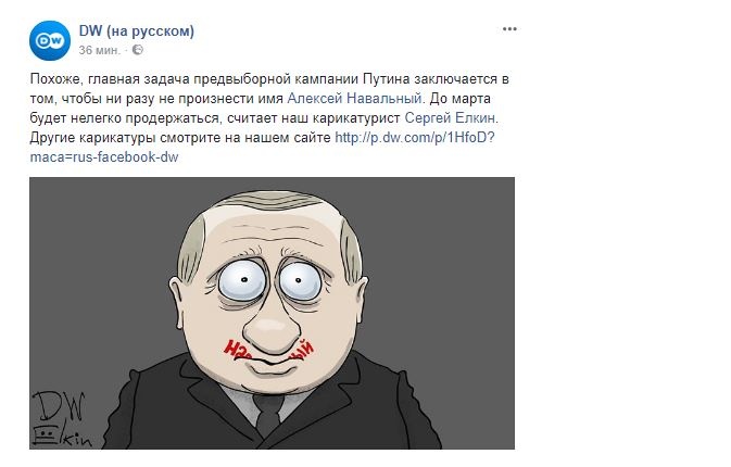 Как сообщает replyua.net, карикатура Елкина на тему «боязни Навального» была опубликована на странице DW. «Похоже, главная задача предвыборной кампании Путина заключается в том, чтобы ни разу не произнести имя - Алексей Навальный. До марта будет нелегко продержаться, считает наш карикатурист Сергей Елкин», - подписан снимок. Напомним, что в интервью журналистам Путин категорически не хочет произносить фамилию оппозиционера. Когда журналисты спрашивают у него о Навальном, Путин называет его «он», «персонаж» и «оппозиционер».
