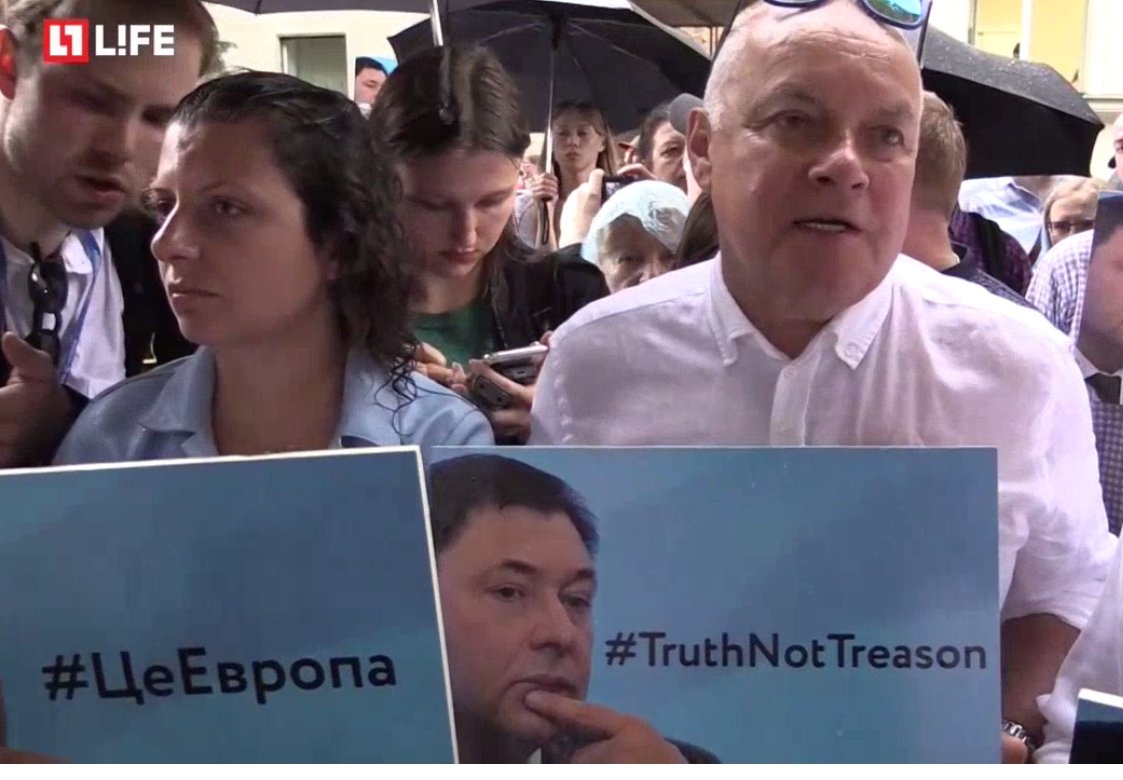 Также пикетчики заявили, что в Украине якобы не проводятся расследования убийств журналистов и ведется борьба против свободы слова, а Вышинский рассказывал «правду о государственном перевороте». Спикерами мероприятия стали известные пропагандисты Кремля Маргарита Симоньян, Дмитрий Киселев и прочие, они назвали арест Вышинского «инквизицией»